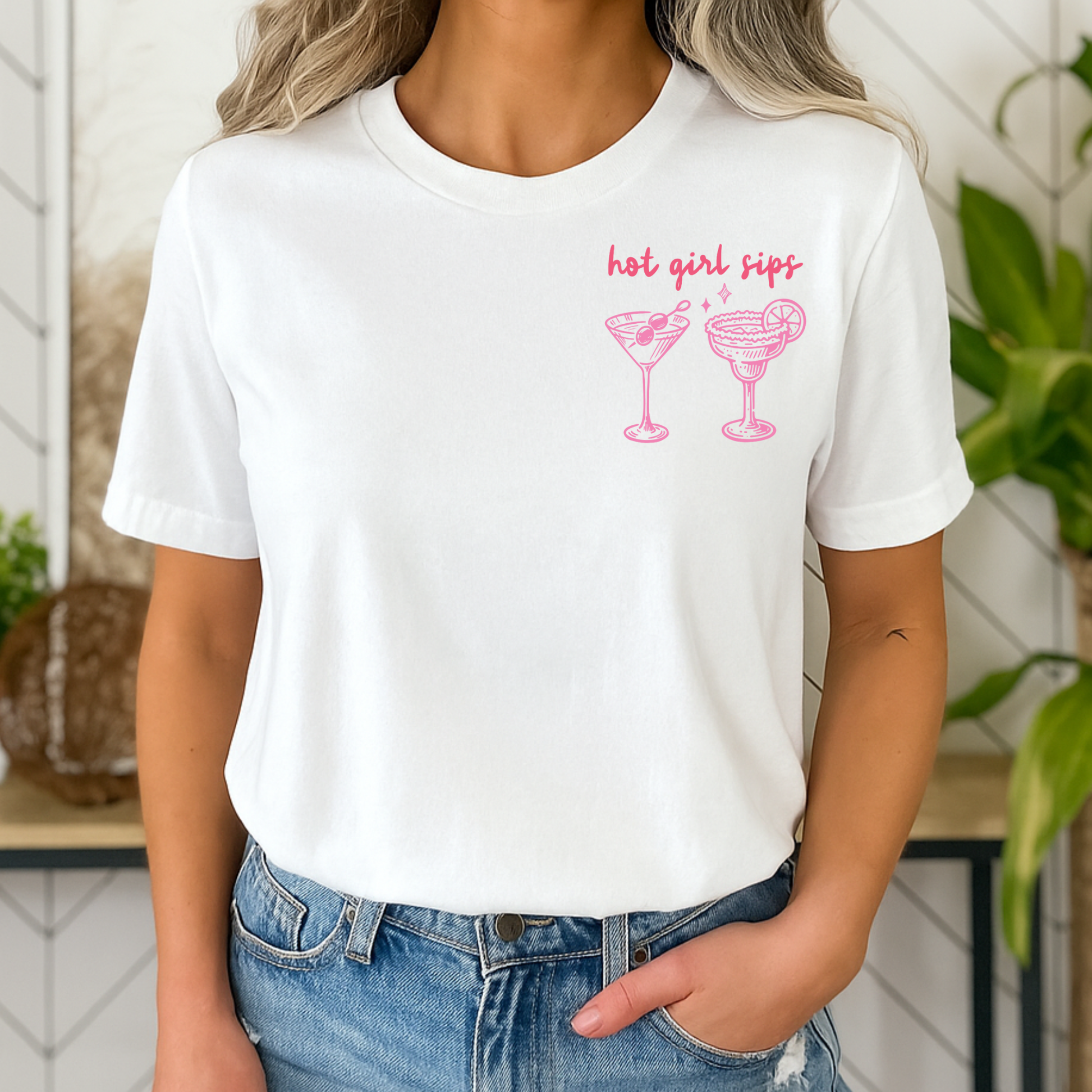 Dit basic dames t-shirt is gemaakt voor hot girls die weten wat ze willen… en dat begint vaak met een goed drankje. De subtiele borstprint met Hot Girl Sips en cocktailillustraties geeft het shirt een speelse, feminine uitstraling zonder te overdrijven.